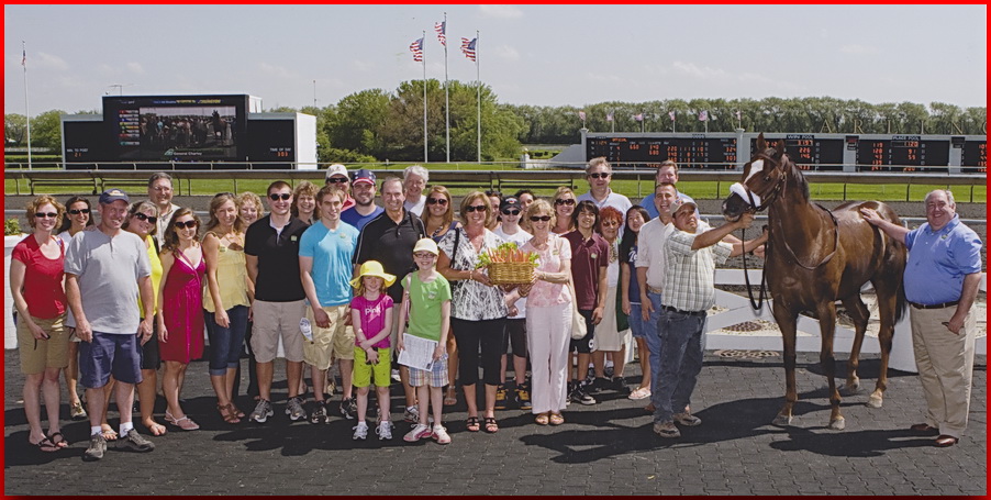 But before he was to leave, Chris and Neil hatched a plan for one last tribue to General Charley. They approached Arlington Park Chairman Dick Duchossois and AP GM Tony Petrillo and asked for their help in honoring Charley one last time before Peg took him home. Together the 4 of them put together a tribute for Charley held between the 4th and 5th races on Memorial Day, where they ushered all us Rabbits to the Winners Circle one more time.