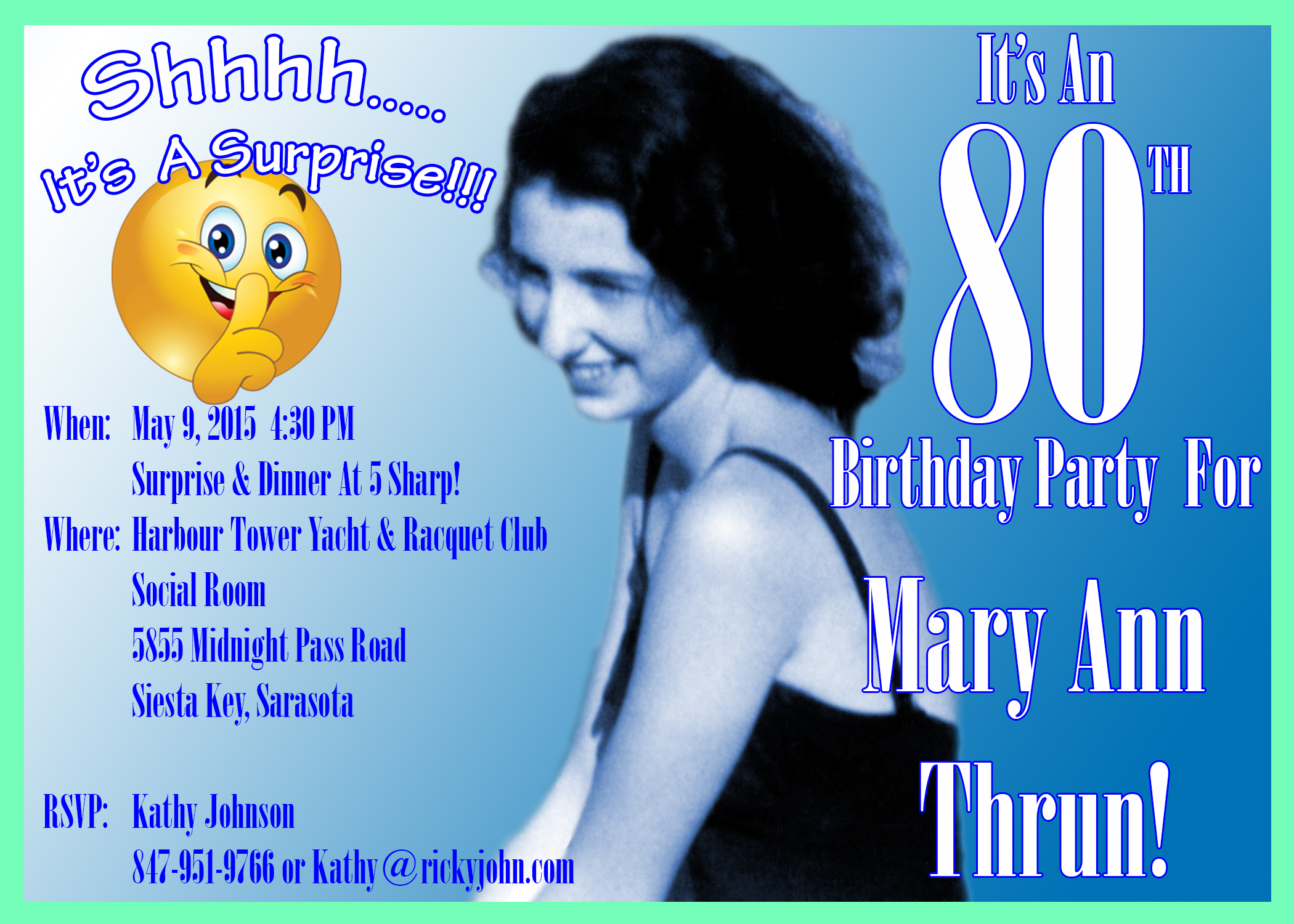 Saturday May 10th, Laurie, Jean, Nancy, Kathy, Steve & myself all pulled off a great surprise party for Mom on Siesta Key in the Condo Party room.