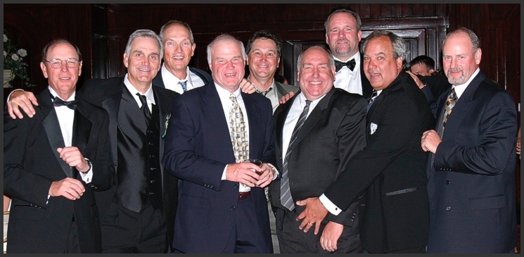 Picture upper left is Kathy with beautiful bride Gina and hunky stud groom Sean. Picture below is all the golf buds. Starting on the left with Billy, Emon (Bob), Roger, Steve, Mike Ricky, Mark, PETEY, and Danny. I don't know what Pete is grabbing for with his left arm.