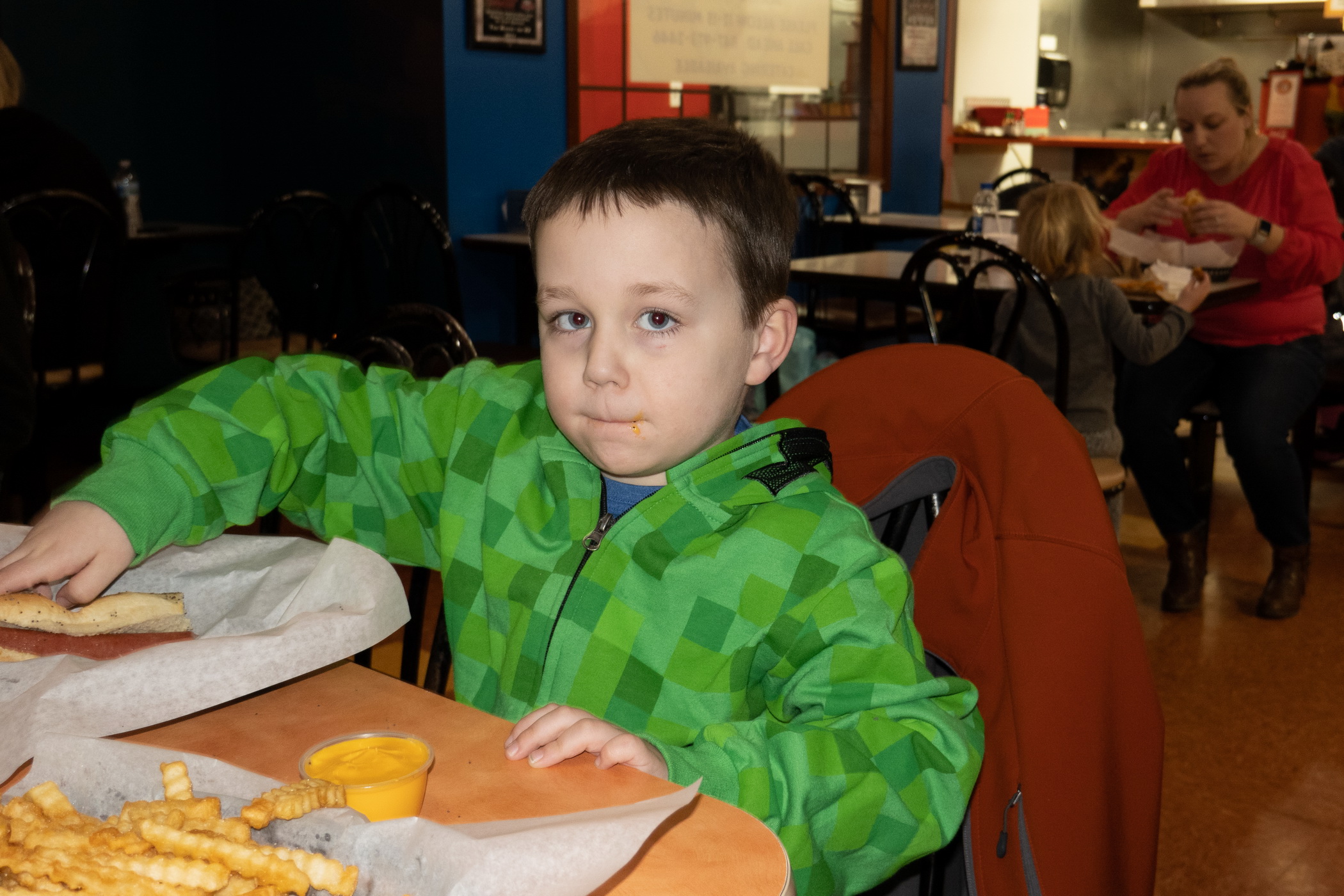 Thors5YearOldBdayDinner_RoostsFoxLake_008_ThorHasAHotDogWithCheese_DSC00136.JPG