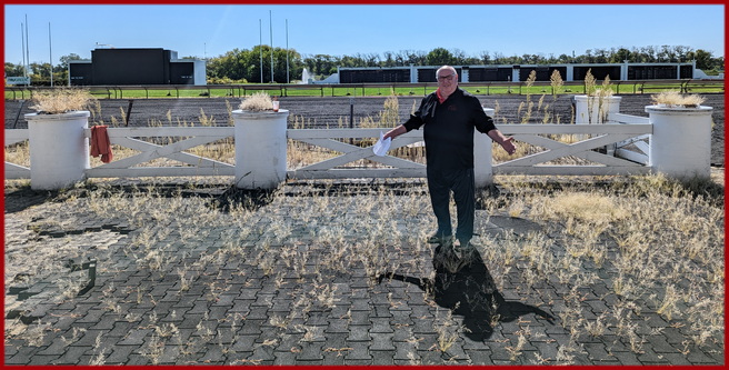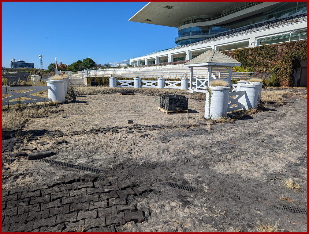 We were directed to pick up each of the 220 Rubber Pavers in an orderly fashion from the east side of the Winners Circle. But, in one of our little joys - we ignored the instructions and went directly to the spot in the Winners Circle where our Champions have stood and took those Pavers from there- laying waste to their orderly removal instructions - leaving a gaping hole amongst the Weeds....